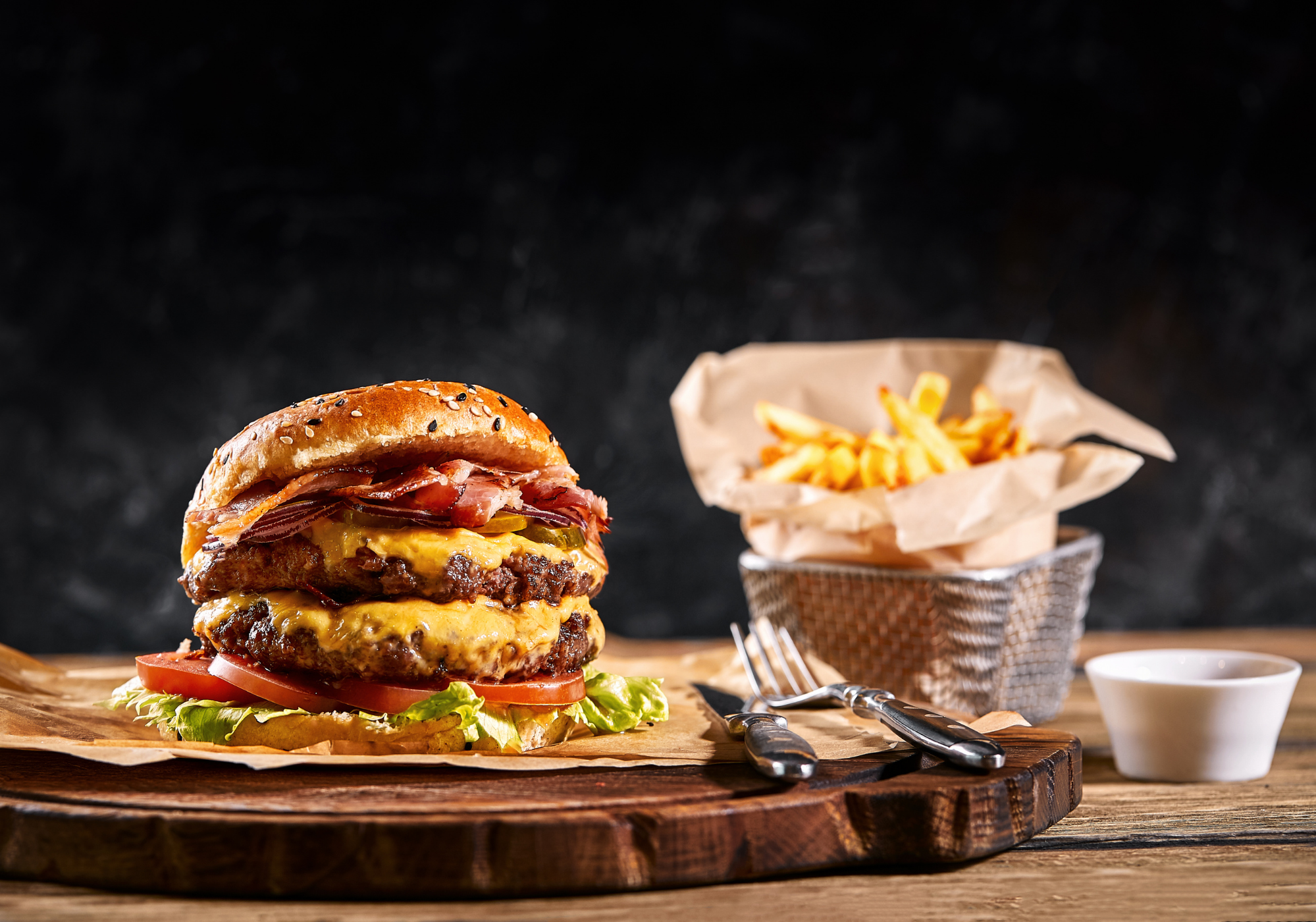Zloženie: hovädzie mäso, cheddar, dvojitá slanina, cibuľa, polníček, Jumbo dressing, BBQ omáčka + 100g hranoliek